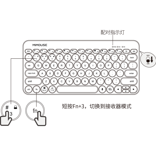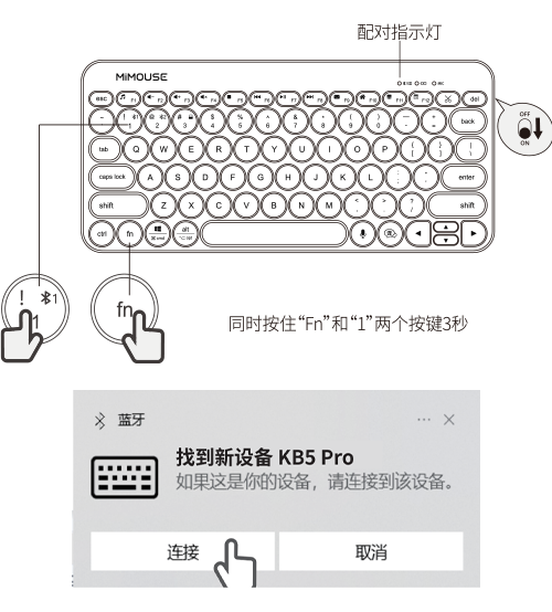 短按Fn+1(或Fn+2),切换到蓝牙模式。长按Fn+1(或Fn+2)组合键3秒,配对指示灯蓝灯快闪,等待配对。