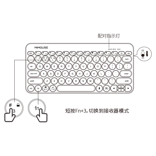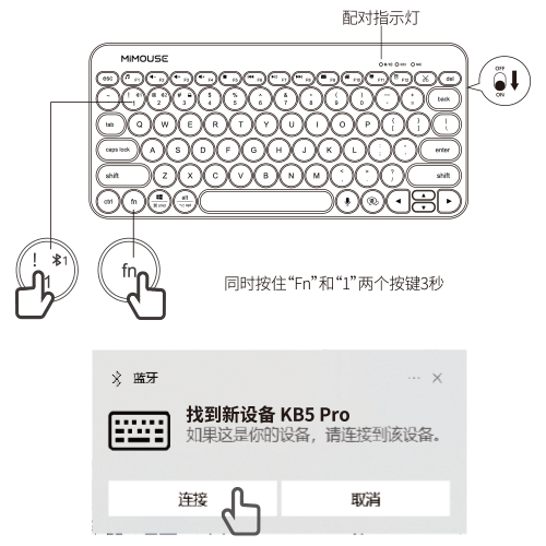 短按Fn+1(或Fn+2),切换到蓝牙模式。长按Fn+1(或Fn+2)组合键3秒,配对指示灯蓝灯快闪,等待配对。