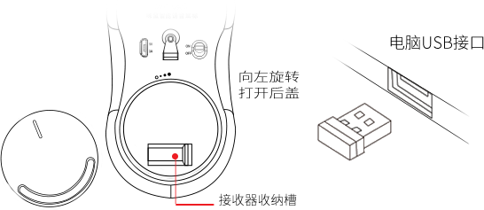 打开鼠标的后盖取出接收器,将接收器插入电脑USB接口,连接鼠标到电脑。